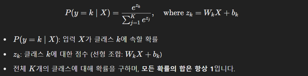 이는 로지스틱 회귀의 확장 형태로, 각 클래스에 속할 확률 값을 출력하고 가장 높은 확률을 가진 클래스를 최종 예측값으로 선택합니다.